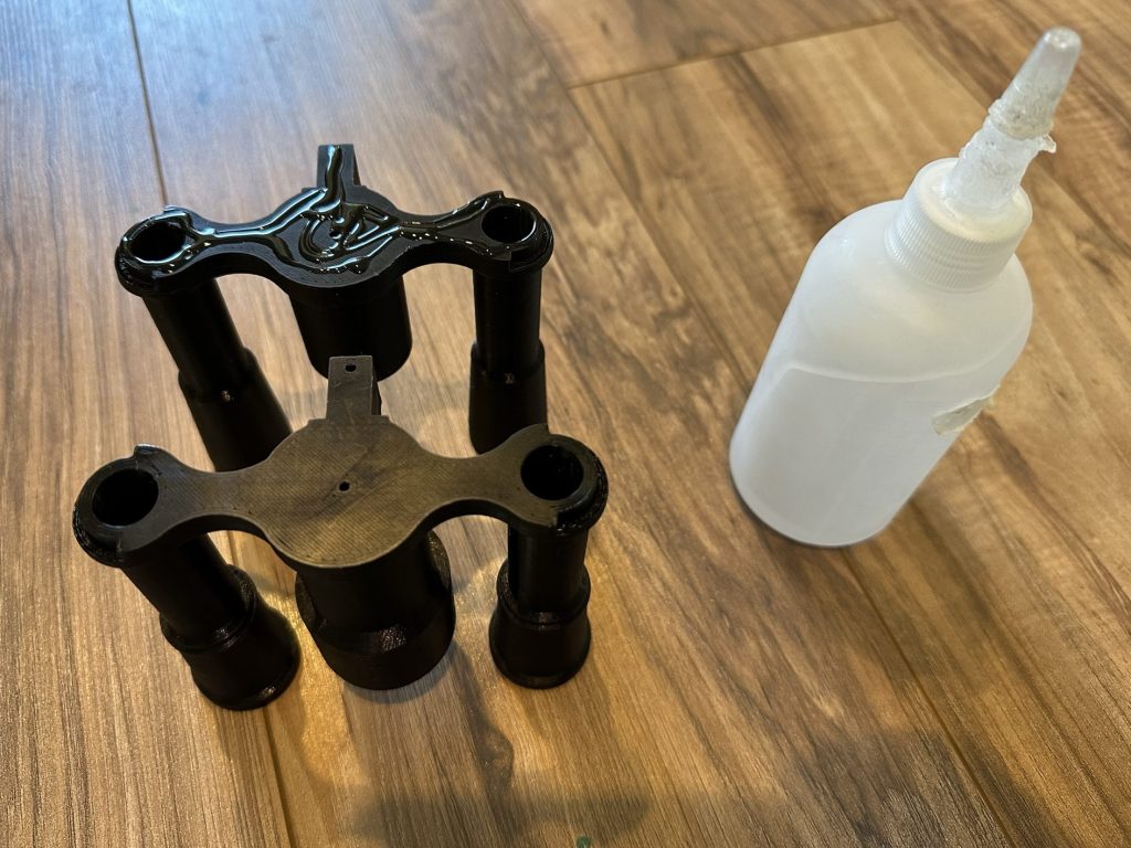 1. Lay out the parts to get an idea of how they go together. This will keep you from accidentally putting it together wrong. Follow the layout shown above. Recommended glue is CA glue (super glue) or epoxy. Use a liberal amount of glue and wipe excess glue off as out go.