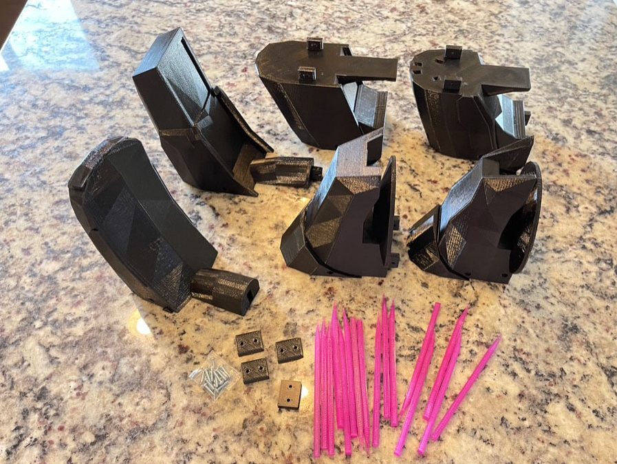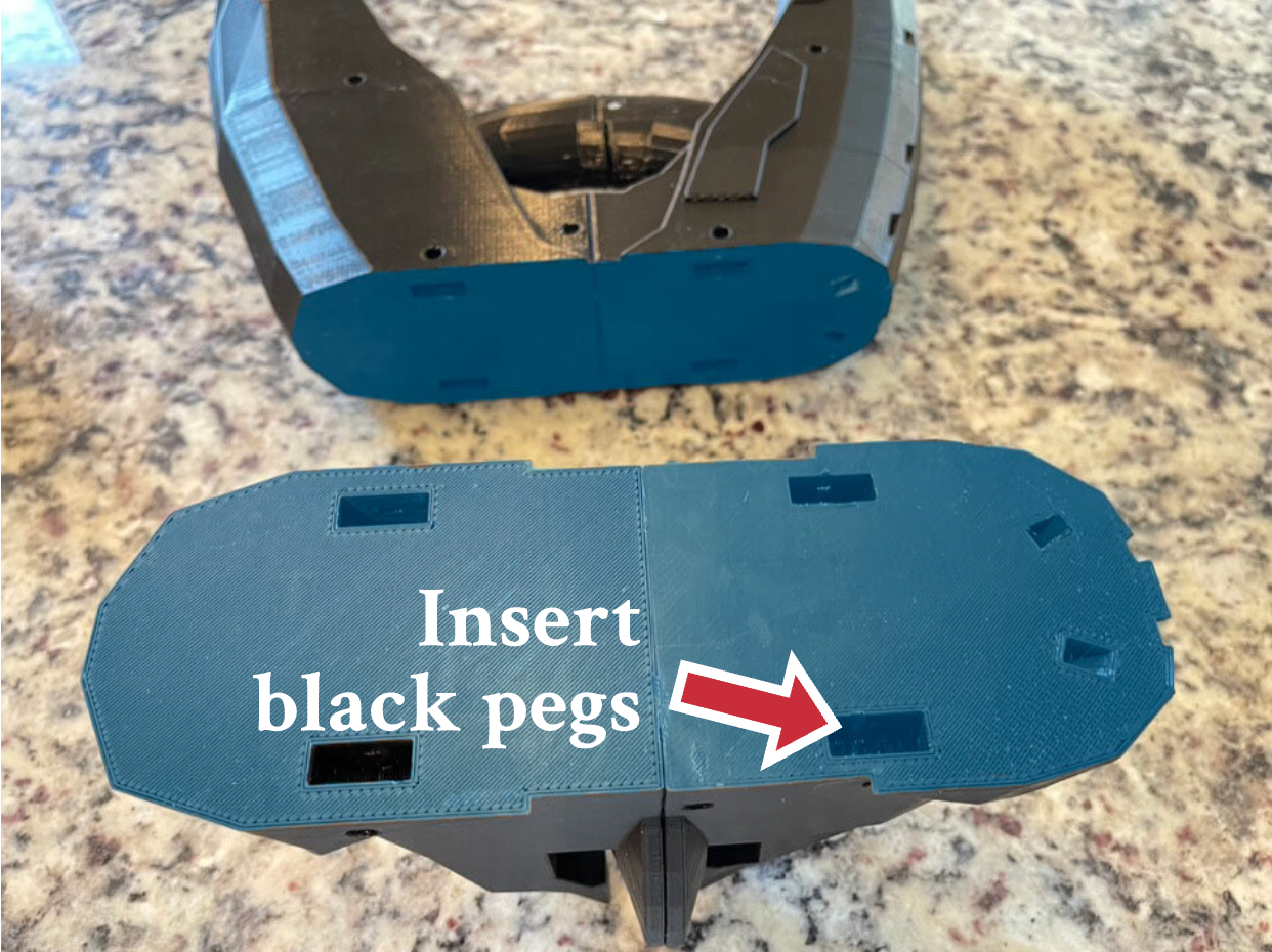 11. Glue connecting surfaces on the 2 parts shown. Insert the 4 black pegs that came with the kit.