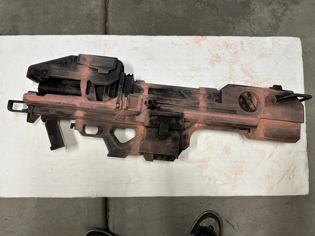 8. Spray puddles of black and green spray paint in bowls or containers then carefully touch up blemishes and spots with small paint brushes. I went over the entire gun with green, then repeated the process with black. I ended up touching up a few times.