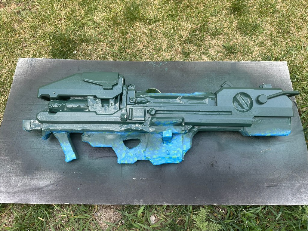 6. Once paint is fully dry and hardened tape off the parts that need to stay black (I forgot to get a picture before painting, sorry). Take your time on this part to save you effort later. Then apply a coat of green paint.