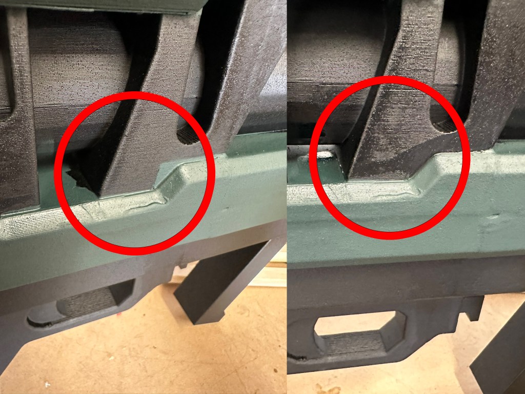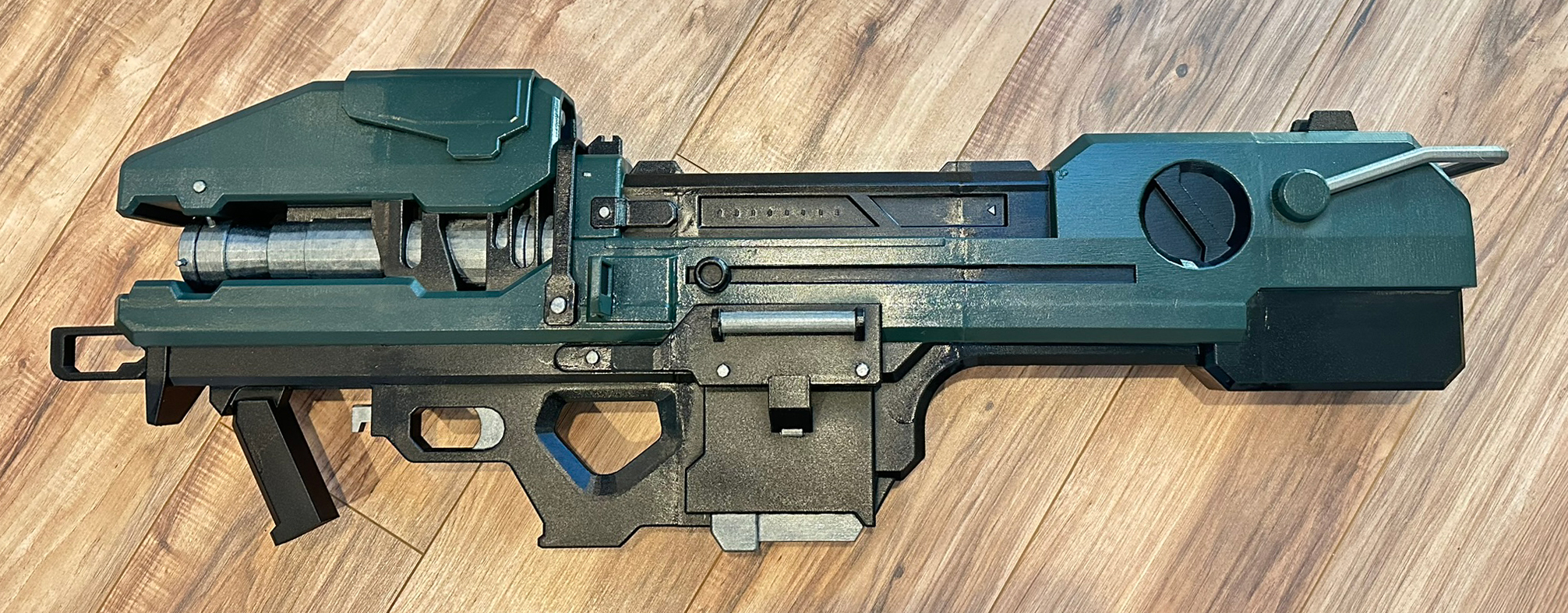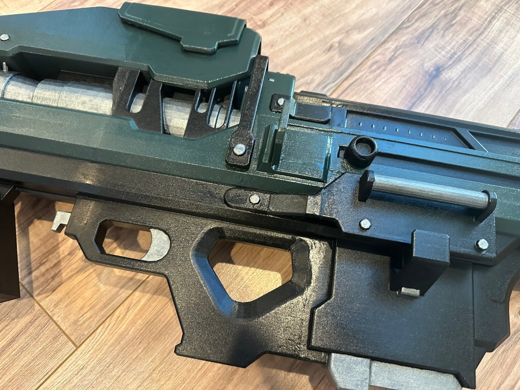 9. Hand paint the silver sections with acrylic paint. I used Valejo oily steel paint. I ended up touching up one more time with green and black after the silver because I was reckless. See the last picture for a color reference.